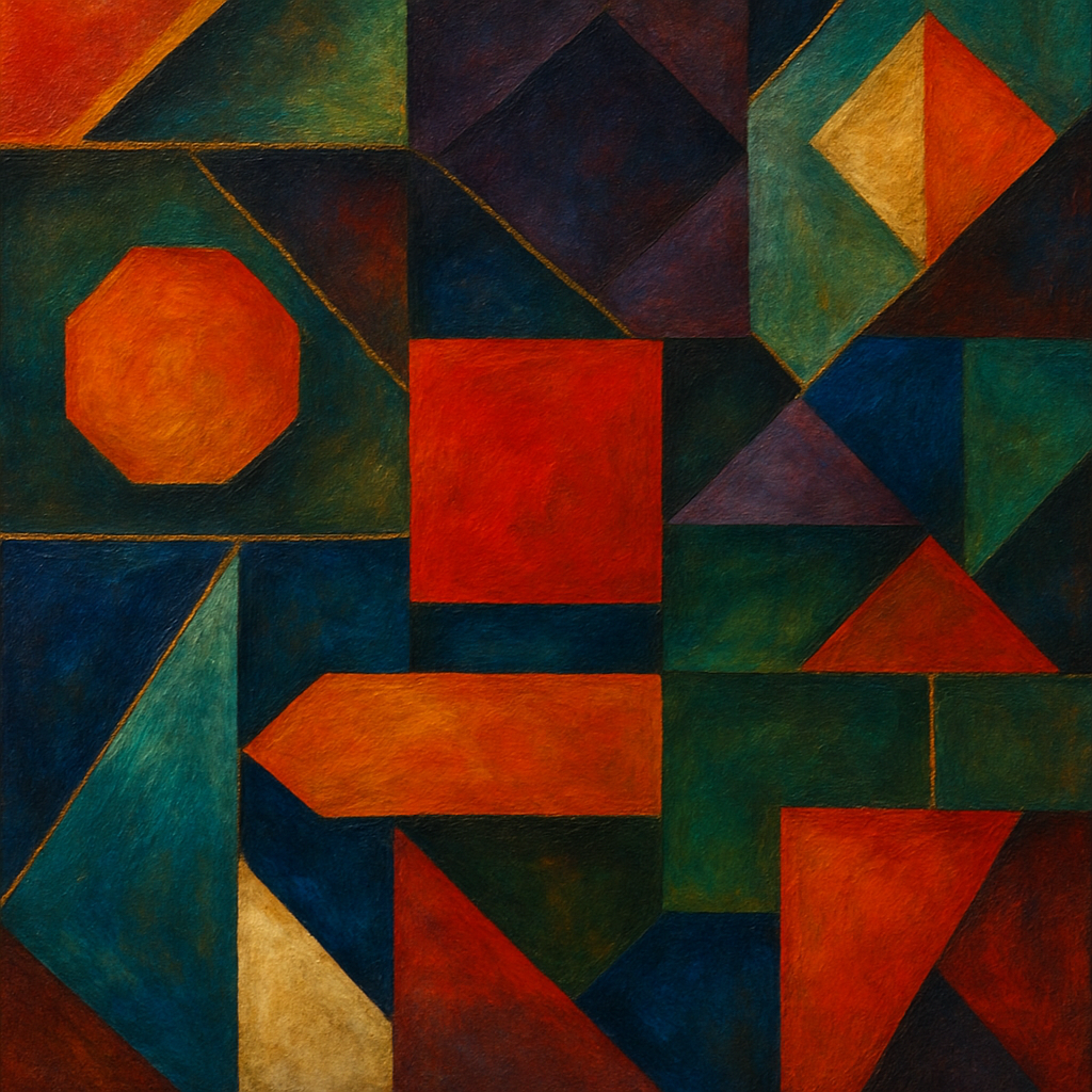 Architectonic Pulse is a dynamic exploration of intersecting geometry, colour contrast, and compositional rhythm. Composed of sharply defined polygons — including triangles, diamonds, squares, and an octagon — this artwork feels both ordered and energetic, like a blueprint electrified with pigment.