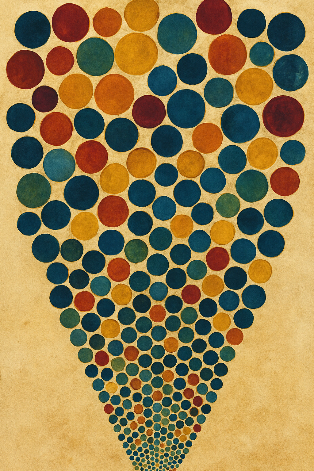 Descending Cone” is a stunning geometric abstraction that evokes both order and illusion. A cascade of multicolored circles — rich in deep teal, rust red, ochre, and golden saffron — appears to narrow into the horizon, creating a trompe-l’œil of depth and motion. The warm vintage parchment backdrop enhances the sense of retro-futurism and structured elegance. This piece is a masterclass in visual rhythm, perfect for modern interiors, studios, and conceptual spaces.