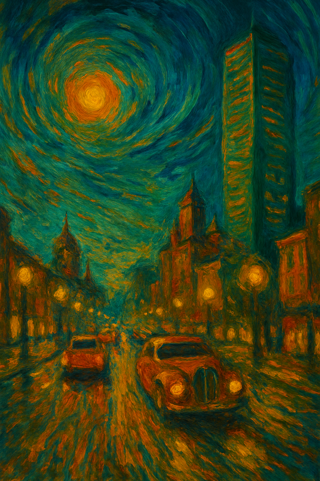 Neon Spiral" captures the electric rhythm of a rainy night in the city, rendered in Van Gogh’s unmistakable swirling brushwork. A glowing spiral sun dominates the sky, echoing The Starry Night, while vintage cars cruise along slick, reflective roads. Towering buildings and glowing lampposts stretch upward, blurring the line between past and future in a cinematic fusion of golden light and teal shadow. This artwork fuses movement, nostalgia, and expressionist boldness — perfect for modern collectors who crave city energy and painterly drama in one frame.