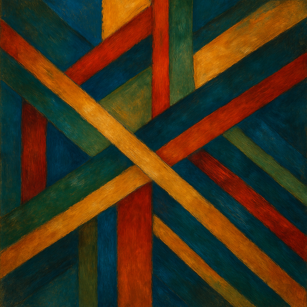 Strataform” is a layered geometric abstraction built on intersecting color bands and architectural rhythm. Bold diagonals in rust, ochre, teal, and forest green crisscross the canvas like structural beams or overlapping threads. The painterly texture gives the illusion of depth, as if woven layers are stacked in a deliberate yet energetic tension. This artwork evokes themes of construction, balance, and movement — ideal for modern interiors, design studios, or anyone drawn to the harmony between bold color and ordered form.