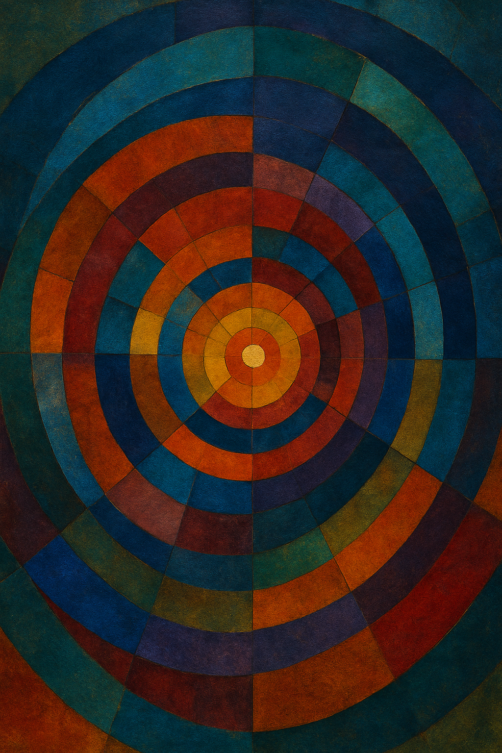 The Great Cone” is a hypnotic exploration of symmetry, color, and balance. This geometric abstract artwork features meticulously aligned concentric rings segmented into warm and cool palettes — from deep blues and teals to fiery reds, rusts, and golden ochres. The composition draws the viewer into a vibrant focal point, evoking themes of order, cosmic rhythm, and meditative focus. Ideal for lovers of Bauhaus structure, color theory, or modernist design with emotional depth.